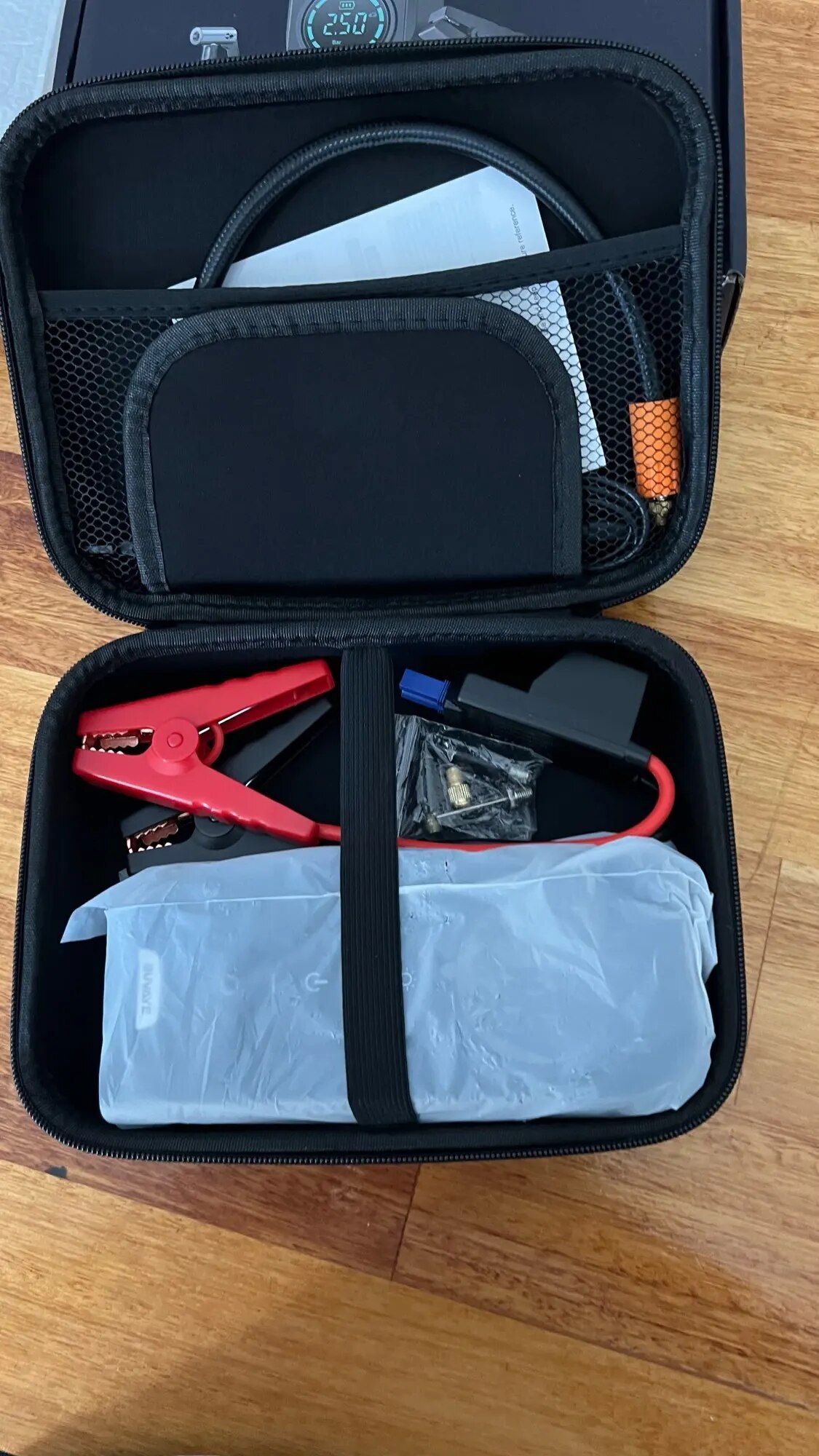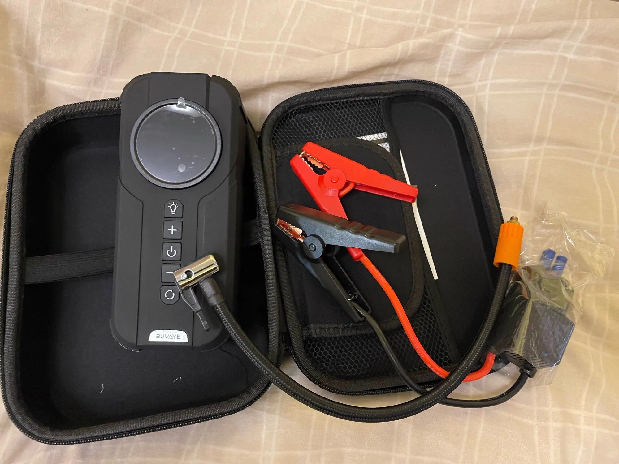 This battery jump starter may not be the biggest at 1500 amps, but what really stands out is its built-in air compressor. It's a bit thicker than other battery units but not by much. It also comes with a handy carrying case. What impresses me the most is how quickly it can fill a low tire. I own another electric compressor that hooks up directly to the car battery, which is one of the bigger models, yet this compact unit manages to fill tires nearly twice as fast. Moreover, it features lights and a digital display for air pressure that can show measurements in pounds and other units. The manufacturer claims it's accurate to within 1 lb, and from what I've seen, it works great and gives faster readings than you'd expect from small compressors. This device also comes with smart jumper cables and air accessories. It's an excellent safety tool for my car, and I've just placed it in my trunk yesterday.