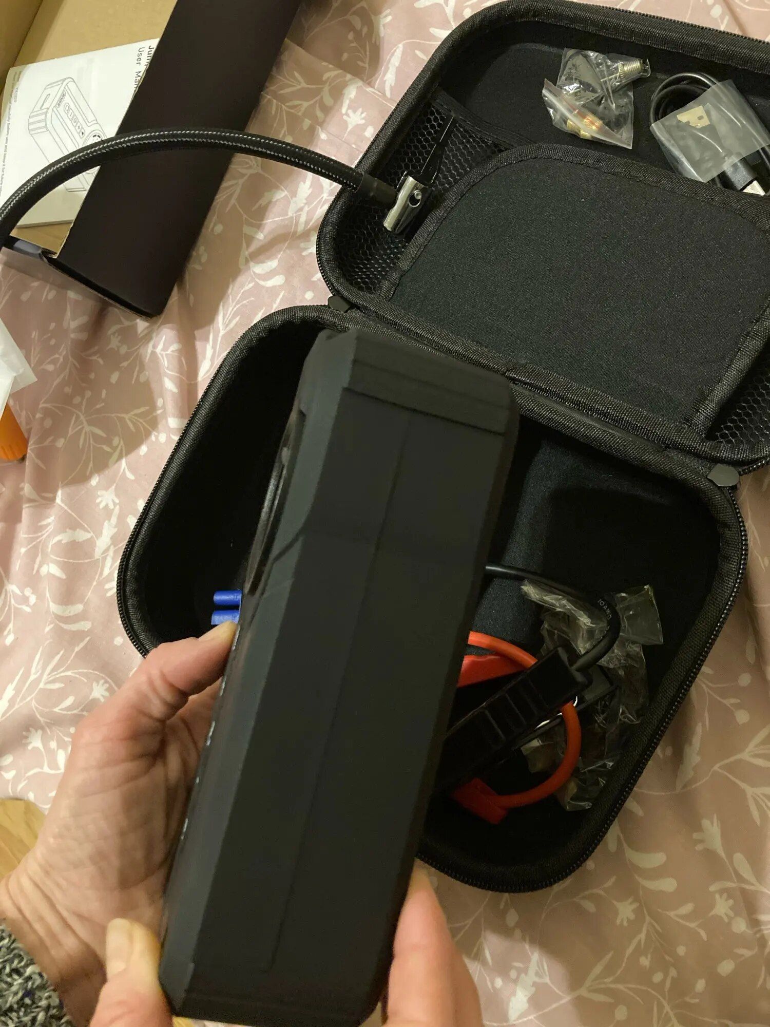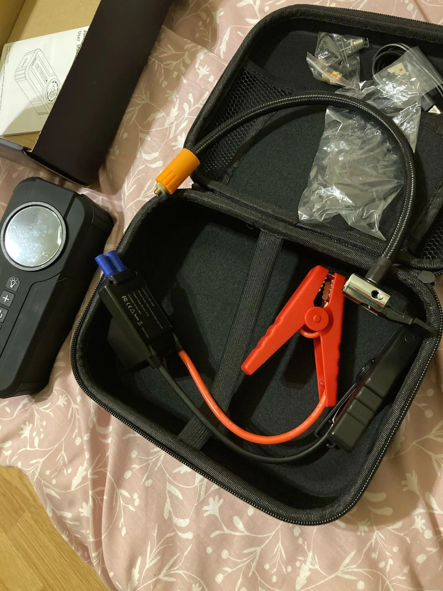 A survival bag in your vehicle is incredibly handy, especially for road trips or if you're frequently traveling. This booster comes in a high-quality bag and is equipped with a starter lug, which is very helpful for any driver facing starting issues, flat tires, or even needing light in the dark, thanks to its built-in lamp. It's a highly beneficial survival tool for various car troubles. Having tested it, it works great and is a useful aid. However, it's important to remember to charge it periodically to ensure it's always ready for use when needed.